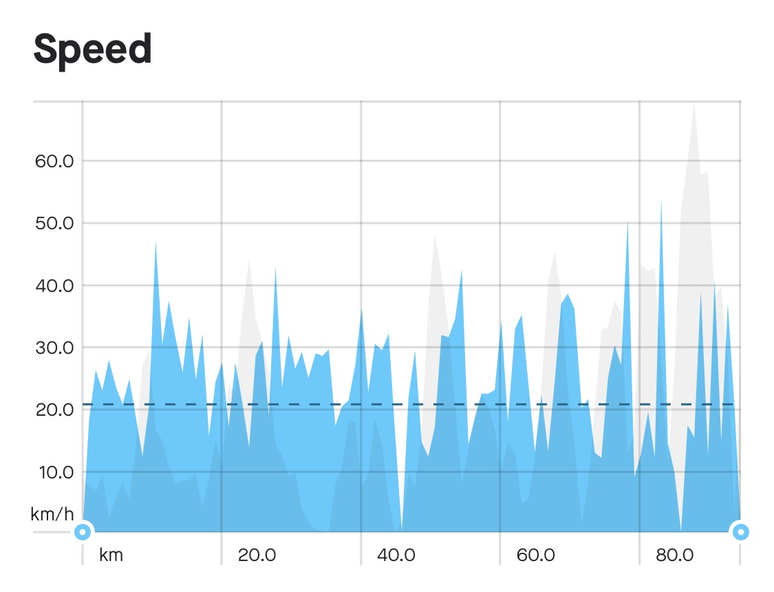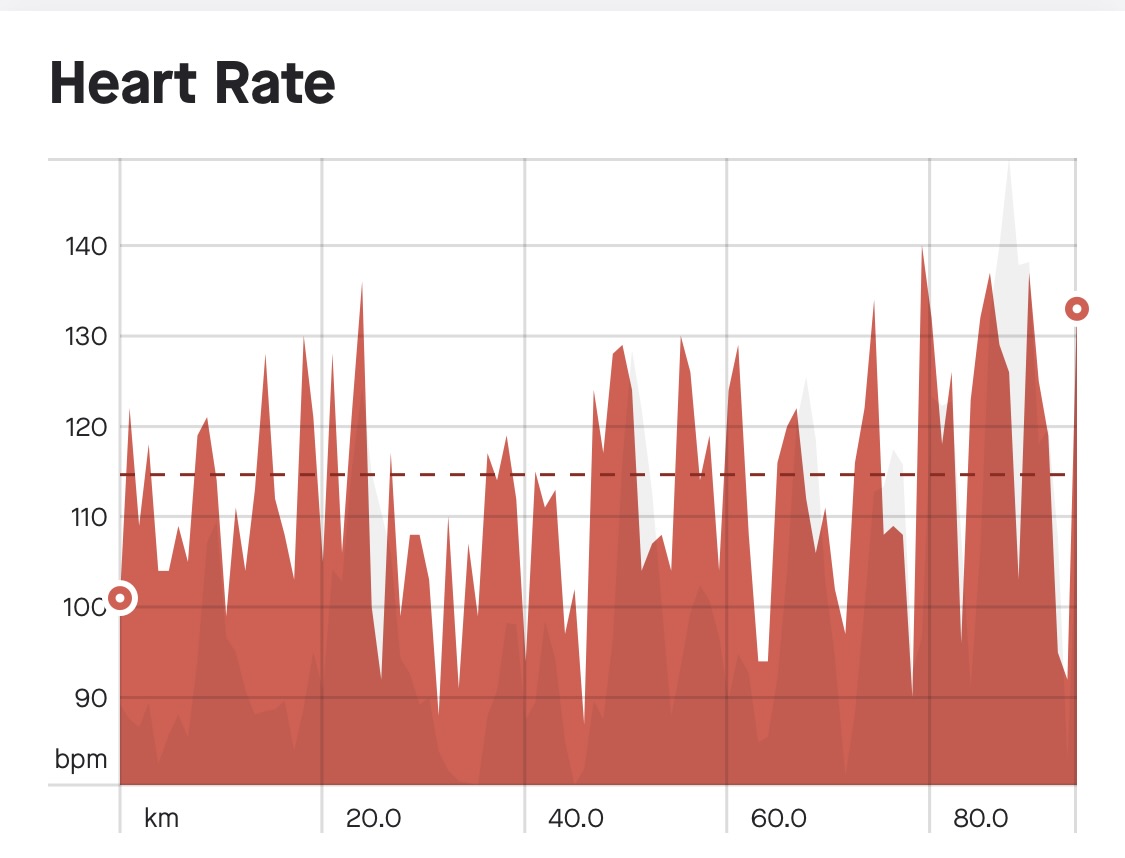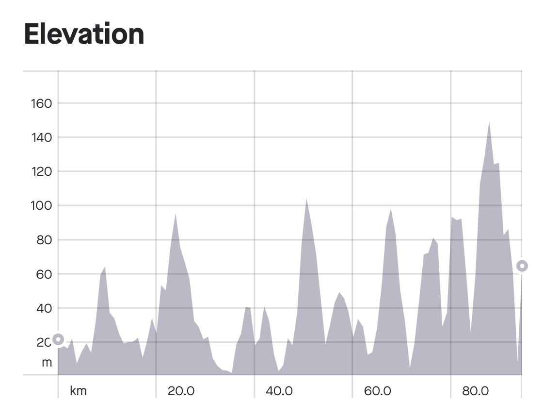 I’m quite tired after the first day, so this is a short-ish entry today. I’ll end with my Strava data, as I did in 2018. First, here’s the route. We did 94.7 km with 1000 m of climbing. Cycling time was four hours 32 minutes, my average speed was 20.9 km/hr, my average power was 113 W, and I used 1822 calories.
