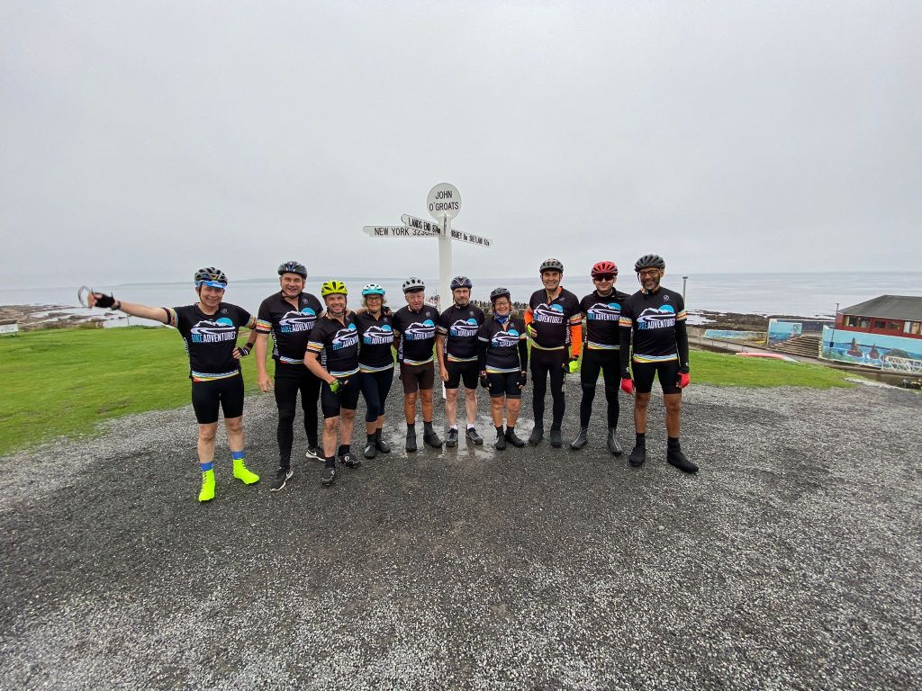 The plan was to cycle the 600 metres to the famous sign and then to take photographs before beginning the formal element of the ride. This went smoothly. The sign was in place, and it was free of the stickers that adorned it four years ago. We bravely removed our jackets to reveal our Bike Adventures jerseys and Andy (who works with Rob) took the picture. Here are all ten of us (three dropped out through illness or injury before the start), and here too are Rob and Andy.