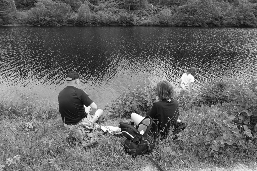 I went down the other side of the hill with Andy. We couldn’t go terribly fast because of all the traffic, but it was good fun, and it took us to the banks of Loch Lomond. It was great to cycle along a path, but it was less good that it was still raining (obvs) and that the path was not in great shape. Denise went down, and two others came a cropper later today. Our worst injury day so far.